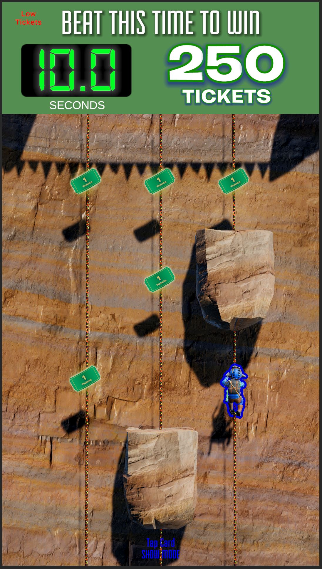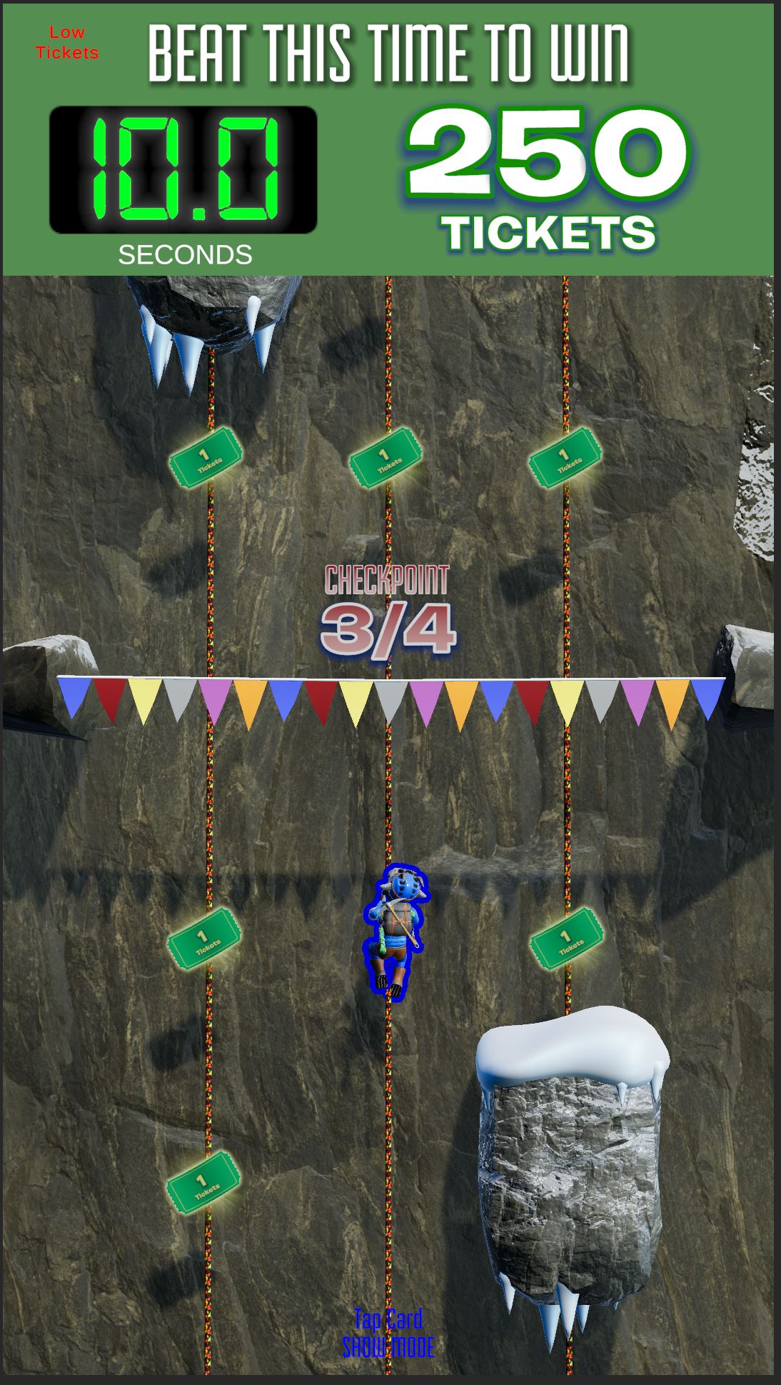 Yeti Encounter: Reach the summit to confront the Yeti. Dodge snowballs, collect tickets and aim to summit for the big bonus in record time. - Use the infinity-loop rope to trek up the side of the mountain, jumping from left to right to avoid rock cliffs as you climb higher.